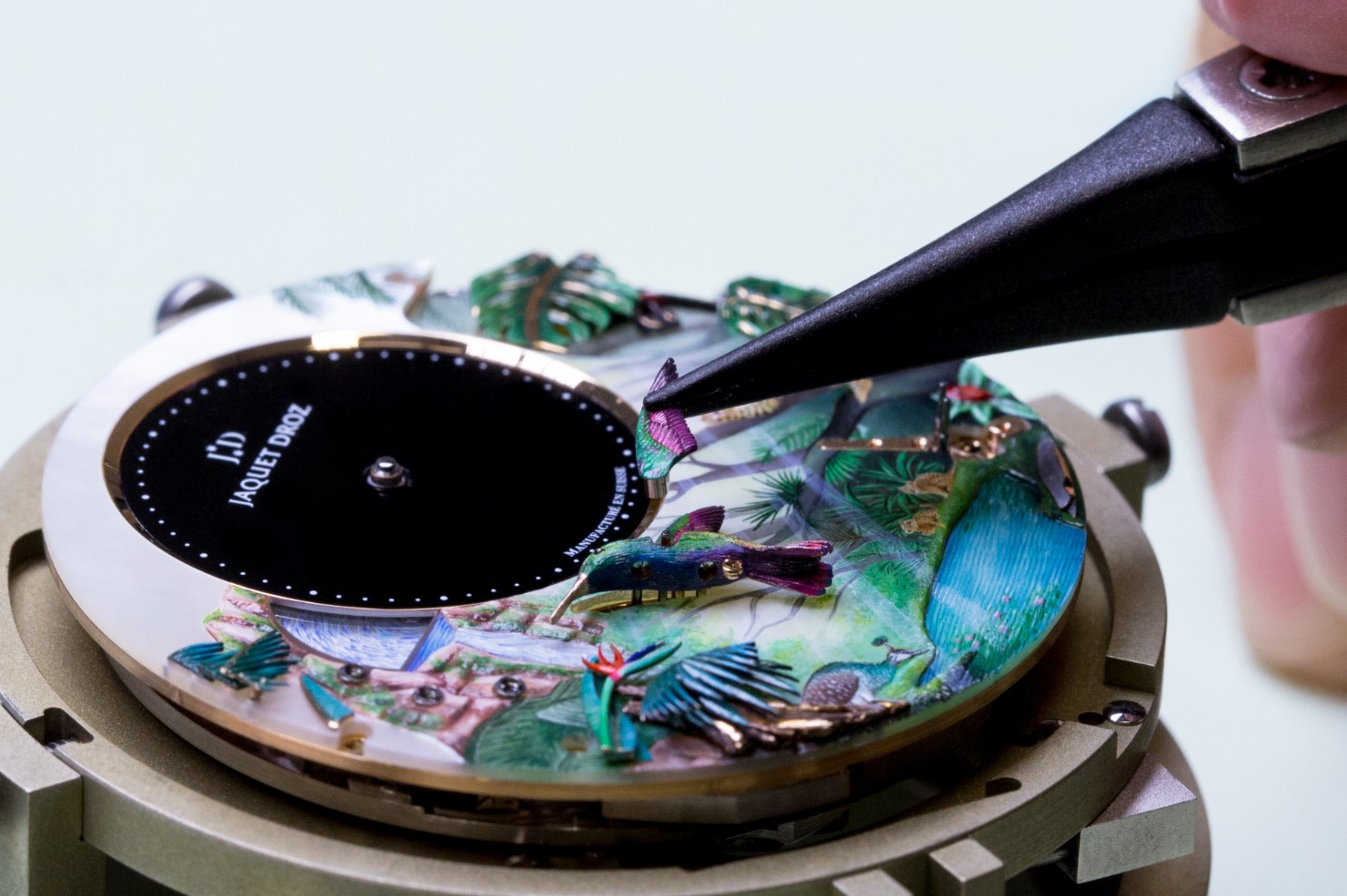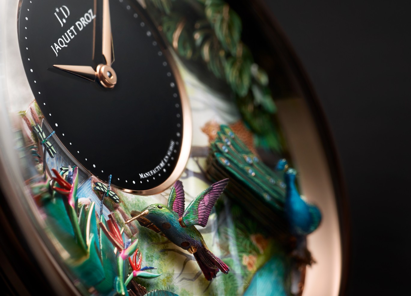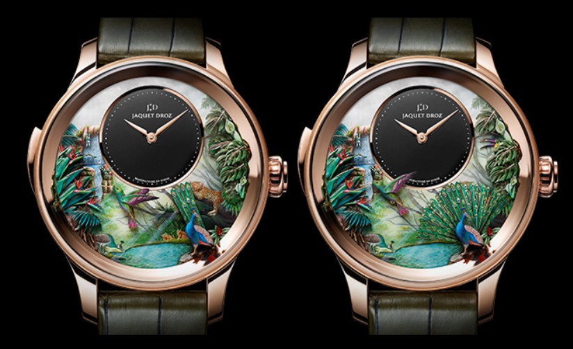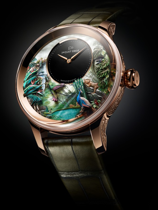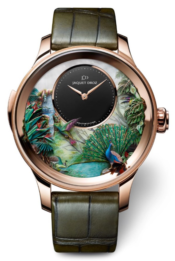 ![]() | Tropical style time bird three asked TROPICAL BIRD REPEATER J033033200 Hand carved and painted white mother of pearl dial, black onyx central dial. Hand carved 18K red gold case and three-dimensional table edge. Hand-carved and painted 18K red gold decoration. Manually winding three repeater mechanical movement. The doll scene includes peacocks, tropical leaves, hummingbirds, hornbills, dragonflies and waterfalls. Power reserve for about 60 hours. 47 mm in diameter. Limited edition of 8 pieces. |
