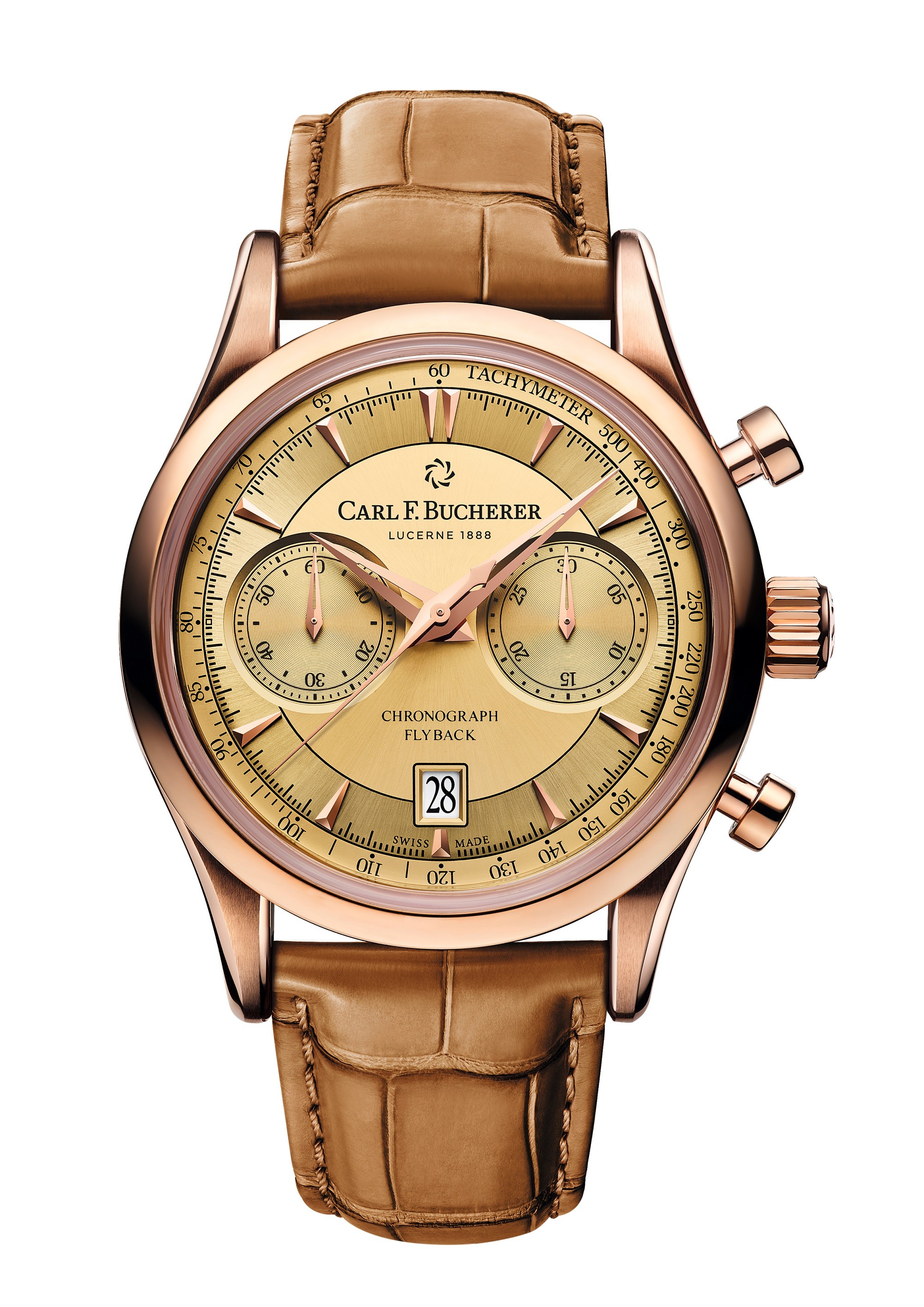 Movement: CFB 1970 self-winding movement, diameter 30.4 mm, thickness 7.9 mm, 25 stone, power reserve 42 hours Function: Timing: Timekeeping minute hand and second hand, fly back to chronograph; Date, hours, minutes, small seconds Case : 18K rose gold, sapphire crystal with double-sided anti-reflective sapphire, sapphire crystal back, water resistant to 30 m, diameter 43 mm, thickness 14.45 mm belt: alligator, 18k rose gold pin buckle dial: champagne